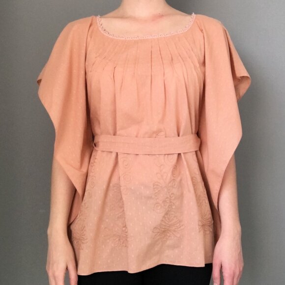 This blouse by Carlos Miele reflects the brand's commitment to luxury and sophistication. Known for blending traditional Brazilian craftsmanship with contemporary design, Miele has created a piece that stands out with its intricate details and refined aesthetic. The peach-colored blouse features delicate pleating along the neckline, wide flowing sleeves, and intricate floral embroidery, showcasing the brand's signature attention to detail.