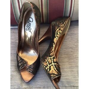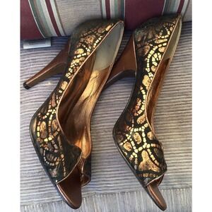 Carlos Peep Toe Hwwl Sz8.5 Black Suede/Copper 3” Heel Pre-Owned Pretty