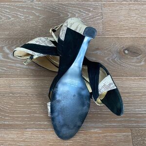 Elegant black and cream wedge sandals. Features a stylish ankle strap. Perfect for any occasion.