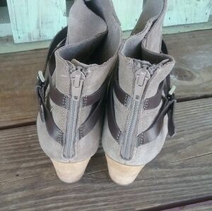 These booties are pre owned but in excellent condition. They are taupe with dark brown straps. The heel is 3.5". Only worn once.