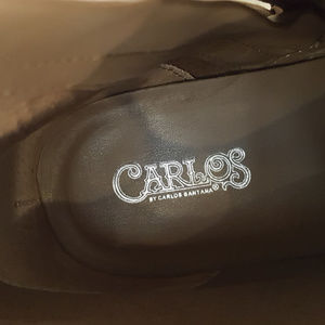 Carlos by Carlos Santana Western-influence Harper ankle boots featuring topline scallop, almond toe, and stacked block heel Shaft approx. 6" from arch, heel approx. 1.75", platform approx. 0.25", boot opening approx. 10" Concealed instep zipper Manmade with microfiber and synthetic sole Size: US 8 M, UK 6, EUR 38, 25cm Size runs narrow Color: Chateau Grey, similar to warm mocha New without tags, original shoe box included, never worn