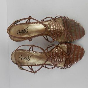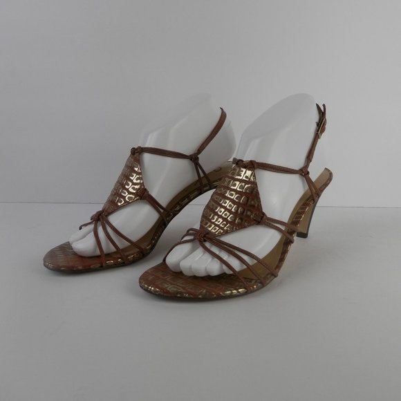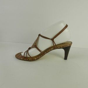 Beautiful sandal with embossed leather panels, and a thin strap adjustable strap around the ankle.