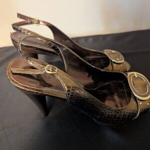 Carlos by Carlos Santana peep-toe slingback heels with a buckle design and reptile print. Made in China. General wear and tear as pictured.