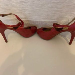 crisscrossing ankle straps that are elasticized and closed with a gold buckle