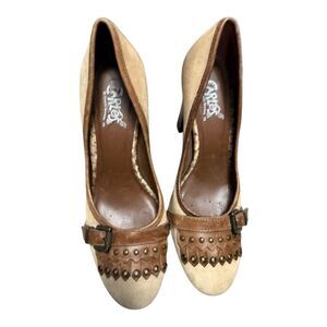 Carlos Santana Sidekick Brown Suede and leather Block Heel. Size 8M decent used condition zoom in to see wear and tear smoke free dog friendly home mark on one shoe seen in pics western aesthetic