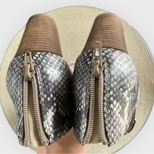 What a great pair of Carlos Santana snake skin booties. They are a womens size 10 and are all man made materials. They zip along the heel for ease of getting on and off. Heel height is 3”. Both zippers work perfectly. Gently worn and are in really great shape. The pictures with the tan circular mat depict the actual colors in my opinion.