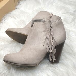 Carlos By Carlos Santana Stacked Heel Ankle Boots. Fringe side. Inner zipper. Rounded almond toe. May have a gray undertone.