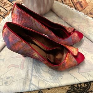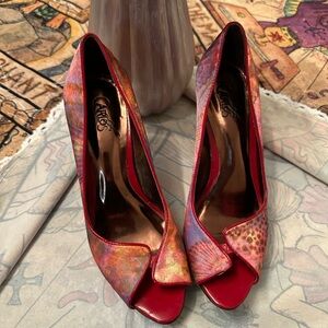 Turn heads and spark conversations in these bold and artsy Carlos Santana heels. With a fiery watercolor pattern in reds, purples, and golds, these statement shoes are equal parts goddess energy and gallery wall.