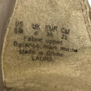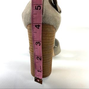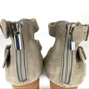 Adjustable buckle closures. Back zipper. Ankle strap. Chunky block heel. Tan / taupe fabric suede upper.