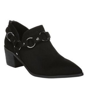 Carlos by Carlos Santana Pointer Ankle Bootie features a metal ring harness detail and a stacked heel, Black Vegan Suede, Metal ring harness, Pointed toe, V cutouts on the side, Stacked heel. Offers always welcome!