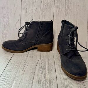 Pre-loved, in overall good condition- Tab in the back to pull booties on were cut off. Color is a dark gray, zippers work fine, laces are good.
