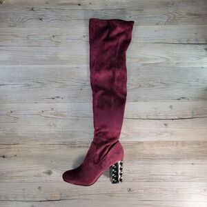 These over-the-knee boots from Carlos by Carlos Santana are made with soft stretchy faux suede material that's a rich wine color and have shiny accented heels. Pull on with ankle zipper.