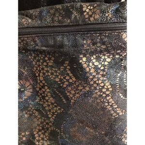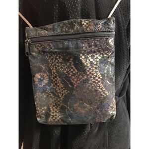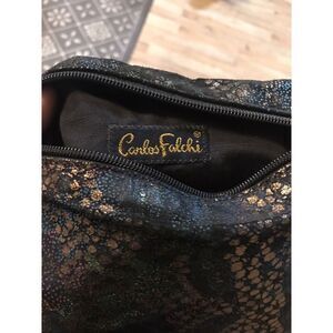 This is a stunning little designer bag from Carlos Falchi, vintage about the 1980s. Highly collectible! This is in great condition, save for a slight crease in the leather which is not a problem in function or appearance in my opinion, and some slight debris in the bottom of the bag. The colors are amazing, I see more each time I look, and they almost change in the light! The simple string leather strap in gold and there is a zipper top closure. One open fabric lined pouch inside. The condition is vintage, see photos for best indication of condition. Measurements are 7" x 8.5" with a strap drop of 18.5 "