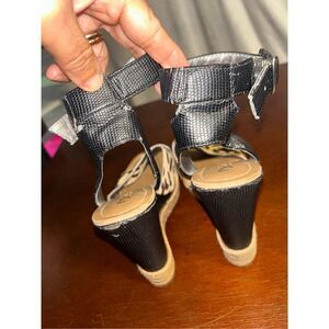 Size 7.5 wedge with leopard print calf fur textured rope style sole. Adjustable ankle straps. Minor cracking on strap otherwise in great condition