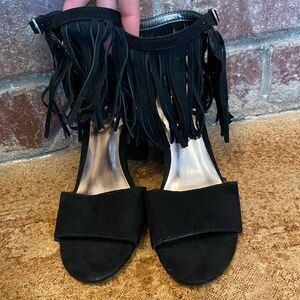 Like new Carlos by Carlos Santana Festival Fringe 'Gilda' Bohemian Black leather Strappy Heeled sandals. EUC, great shape, size 5.5, leather, approximately 3” stacked heels. See pictures for details.