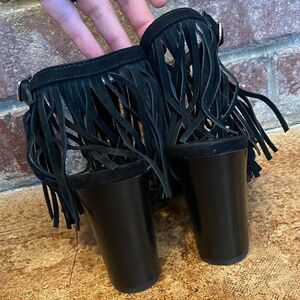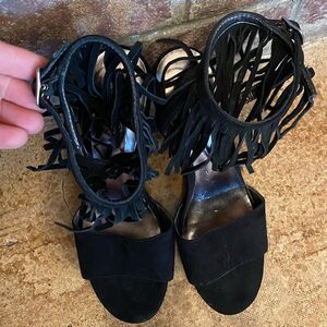 Like new Carlos by Carlos Santana Festival Fringe 'Gilda' Bohemian Black leather Strappy Heeled sandals. EUC, great shape, size 5.5, leather, approximately 3” stacked heels. See pictures for details.