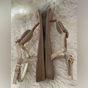 Adjustable buckle closure at back strap; rhinestone embellishment at T-strap