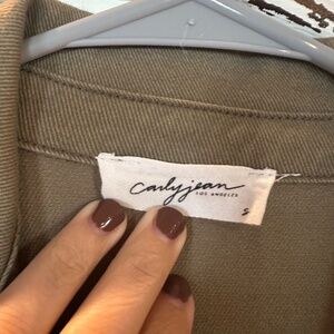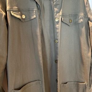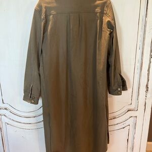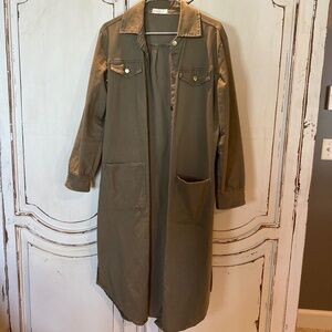 Stylish olive long coat. Features buttoned chest pockets and front pockets. Perfect for layering.