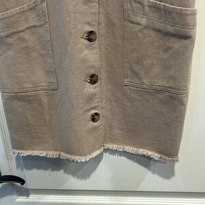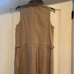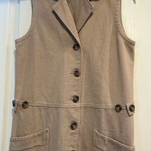 Stylish sleeveless vest dress. Features button-down front. Includes large front pockets. Perfect for layering. Thick material, raw frayed hem, could be worn as a dress or a vest, chic and timeless. Great condition.