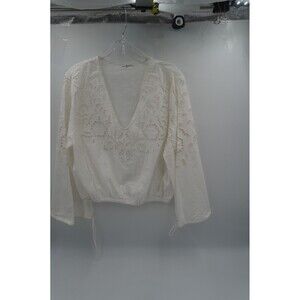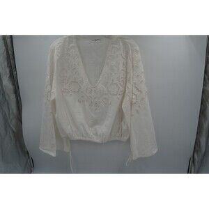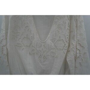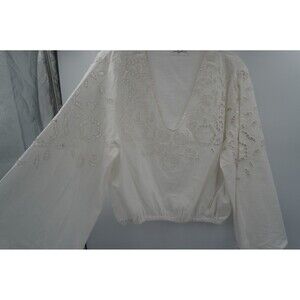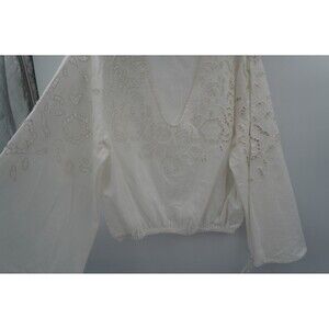 Pre-owned Carly Jean Los Angeles White Eyelet Lace Blouse V-Neck Bell Sleeve Tunic Size L. This beautiful white blouse from Carly Jean Los Angeles features a delicate eyelet lace and embroidered design throughout the body and sleeves. The top has a flattering V-neckline, long bell sleeves, and a subtle elasticized hem for a comfortable, relaxed fit. It is a perfect example of the brand's bohemian and timeless style, making it ideal for a variety of occasions, from a casual day out to a stylish weekend look.