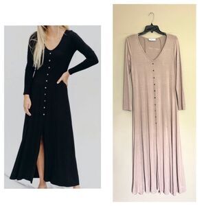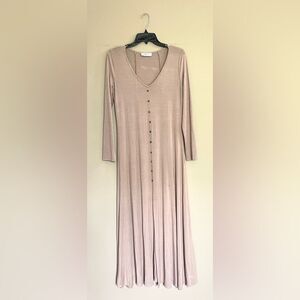 Super soft and comfy taupe maxi dress by Carly Jean Los Angeles! Size Medium. Button detail on the front. Long sleeves. V neck. Slit in the middle. In good used condition!