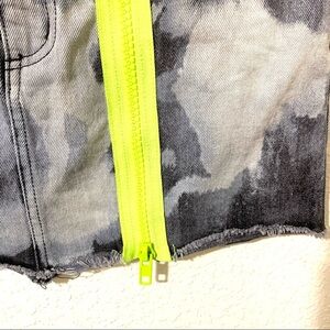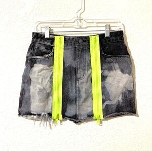 Description: denim jean high rise mini skirt by carmar. It has neon yellow functional zipper detail on the front and a raw hem.