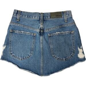 Distressed denim mini with black zipper accented with clear rhinestones.
