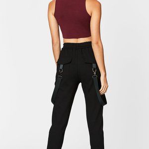 Black pant with cargo pockets on front and back, elasticized waistband, and side slit pockets. Features decorative clasp harness that loops from waist to back pocket. Tagged a size 10 - only 1 available.