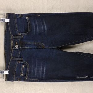 CARMAR Women's Blue Dark Wash Five Pocket Mid Rise Button/Zipper Front Closure Ripped Distressed Skinny Jeans. 67% Tencel, 30% Cotton, 3%™ Spandex. Fading On Front Pockets. Measurements approx. Flat Lay. Waist: 14, Rise: 9.5, Hips: 14.5, Inseam: 30. Size 27.