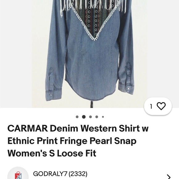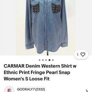 Stylish denim shirt with ethnic print. Features fringe detailing and pearl snaps. Perfect for casual wear.