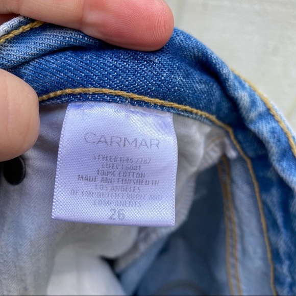 Carmar Denim 26 distressed. Ripped knees. Straight Leg boyfriend jeans. High rise. 100% cotton. Los Angeles. Style D462287. 5 pockets. Waist measures 15.5” across. Rise measures 11.5”. Inseam measures 27.5”. Minor wear. See photos for details.