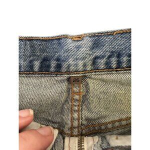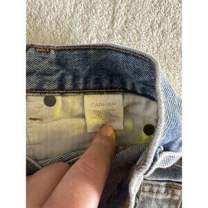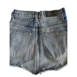 Pre-distressed areas with fraying. Waist across = 13 inches.