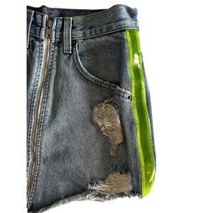 Carmar Distressed Denim Mini Skirt W/ Neon Yellow Stripe & Zip Front Women 25