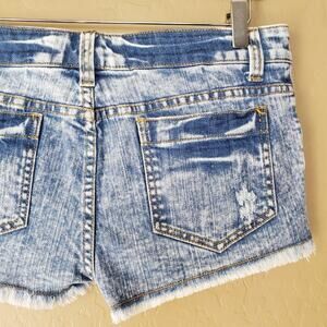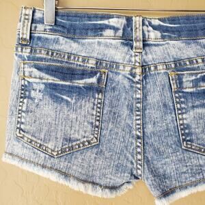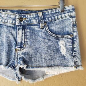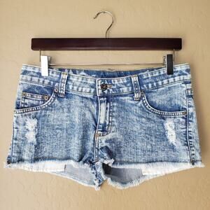 Carmar distressed frayed acid wash denim shorts, size 28. Shorts zip and have a button fly closure.