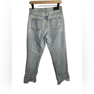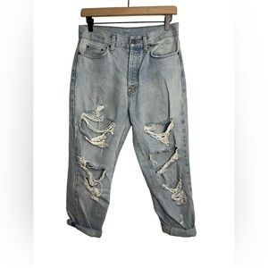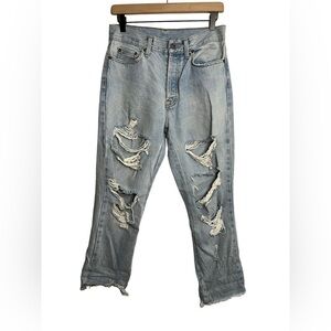 High waisted, high rise, raw/frayed hem, button fly