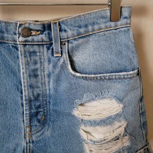 Carmar blue denim shorts, size 27. High rise. Non-stretch; Non-stretchy. Cut off, rolled cuffed hem. Distressed/destroyed. Hidden button fly closure. Boho. Festival. Hippie.
