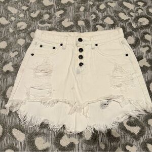 Fit & Style: Low-rise, micro mini, waist 13” flat (fits like a US 2), 10” front length, 13” back length. Button-front closure, heavy distressing with signature “bullethole” details, raw-edge hem.