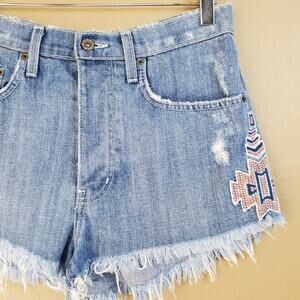 Carmar high waisted cut off denim shorts, size 26. Raw, frayed hem. Tribal/Aztec blue, pink, and white side embroidery. Light distressing. Boho. Festival. Shorts button and have a button fly closure.