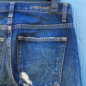These Carmar jeans feature a medium wash denim, factory distressed rips and tears, fading, a high rise and a straight leg.