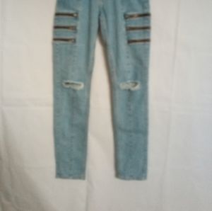 Carmar skinny jeans in a light wash. Has 3 zippers on each side on the front. Distressed, measures approx. from back part of waist band to crouch 11" down. In really good condition, size 26.