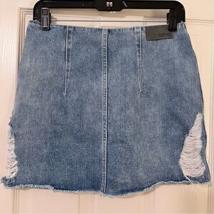 CarMar Jean Skirt- Shredded -you can always sew cool background print fabric as a stabilizer and design accent… I mean if I could fit into this, I would- it has so many possibilities… Anyways, it has a button fly and fringe raw hem. It’s really cute. Size 28.