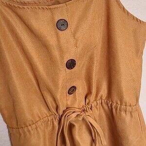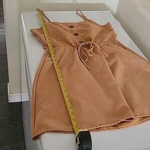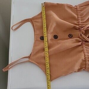 in great condition, no holes or stains. straps are not adjustable. Buttons are decorative and do not actually button up. waist tie is adjustable. unknown size, please see photos for measurements. best fit a small or medium.