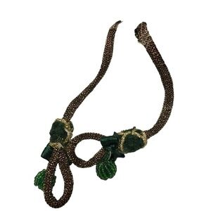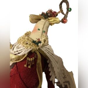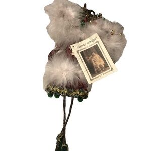 Beautiful Collectible Sift Sculptured Doll by Carmen Manago. Red with attached feathers/tiny Christmas ornaments. Shawl/necklace. Dangling legs with green bauble shoes. Measures 14”. She has the original card and tags. Original box has some damage on one end where the sticker was ripped off. It was not originally mine but purchased at Auction, so I am