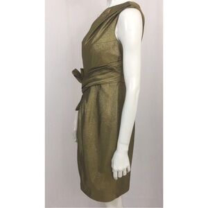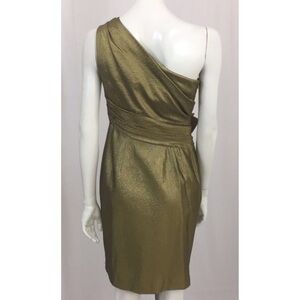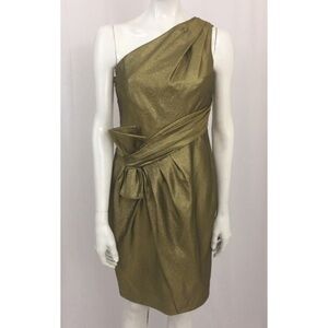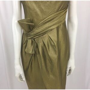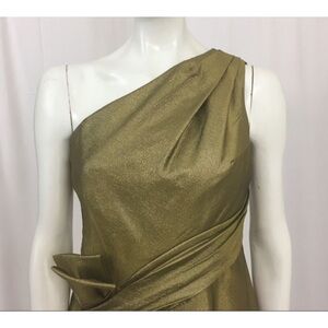 CARMEN MARC VALVO Gold Metallic Cocktail Pleated Bow One Shoulder Dress Size 4