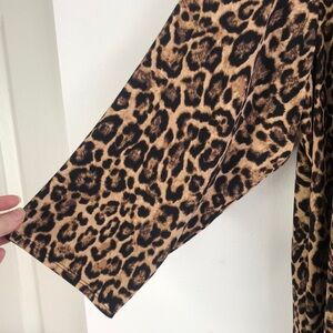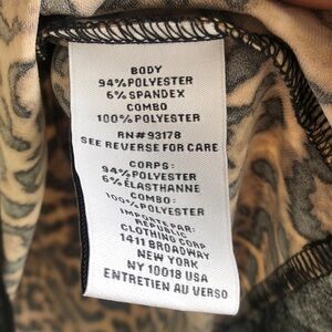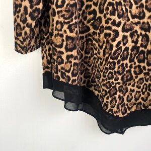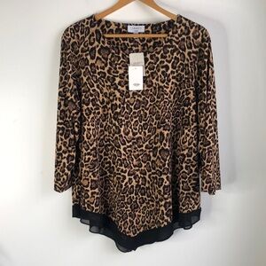 Stretchy abstract animal print blouse with triangle point black chiffon hem. 3/4 length sleeves. Approx 25” from armpit to armpit and 25” from shoulder to short part of hem (sides).