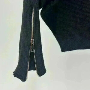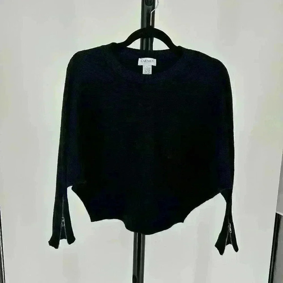 Carmen Marc Valvo Black Ribbed Cropped Dolman / Batwing Sleeve Crewneck sweater. Sleeves have zippers at cuff for dramatic effect. Excellent condition, no snags or damage of any kind. Please see photos with measurements to ensure sizing.