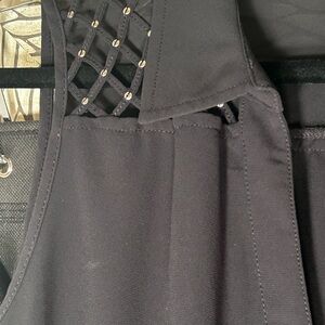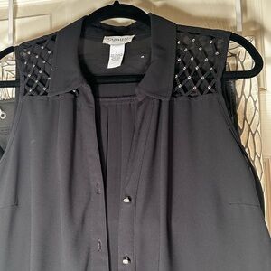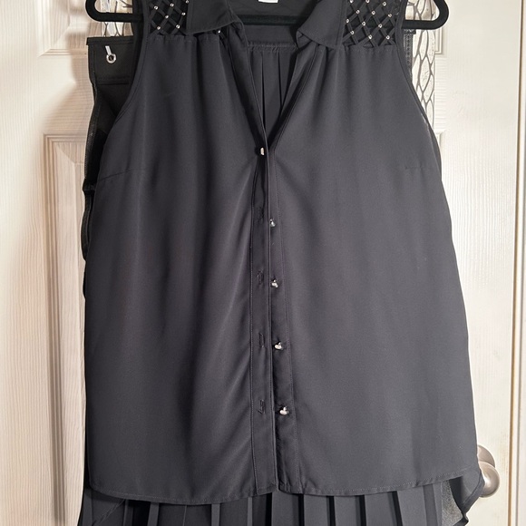 Chic black blouse with studded shoulders. Button-down front. Perfect for stylish outings.
