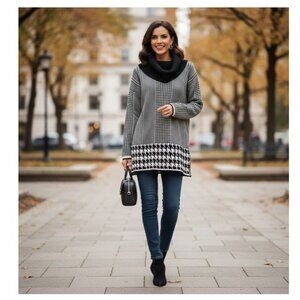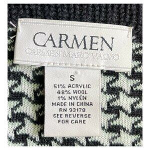 Classic Carmen Marc Valvo black and white houndstooth print sweater in size small. Features a cozy cowl neck and is made from a comfortable acrylic blend.