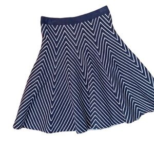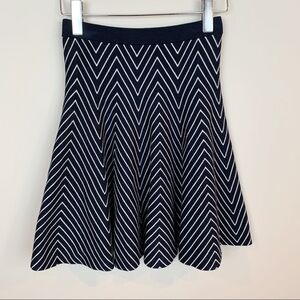 Navy blue and white chevron stripe pattern fit and flare mini skirt by Carmen Marc Valvo. Luxe, thick, heavy knit sweater material; unlined. In excellent used condition.