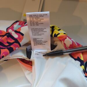 The Carmen Marc Valvo Classic Shirred Waist Bikini Bottom in size Medium features a beautiful floral pattern in vibrant multicolor. Made of nylon/spandex, this bikini bottom is designed for comfort and style, with a shirred waist for a flattering fit. The garment care instructions recommend hand wash, and it is lined for added coziness. Perfect for beach or pool days, this classic bikini bottom from Carmen Marc Valvo is a must-have for any woman's summer wardrobe.